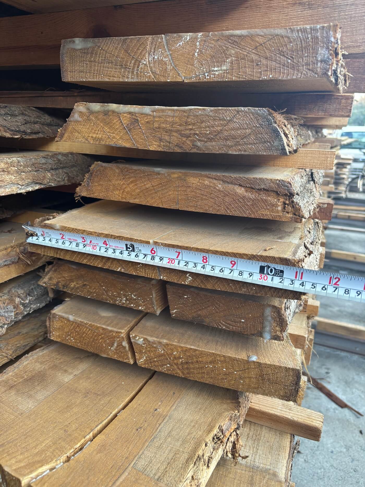 山梨の山で育った国産クリ材を、板材に製材しました。乾燥済みです。木目や材の厚みを、ぜひ手に取って確かめてみてください。